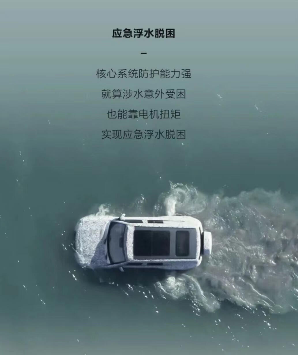 This mode is passively triggered and belongs to passive safety. When the intelligent wading detection system detects that the vehicle is floating, it automatically switches to this mode, enabling driving, steering and U-turns in the water to help the owner escape.